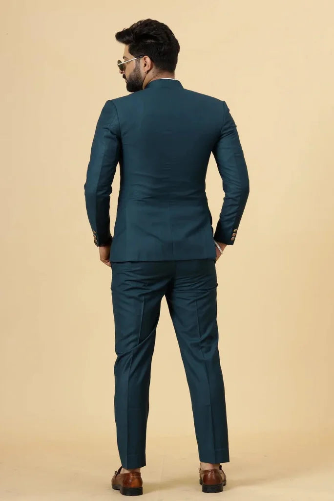 A Teal Blue Bandhgala Jodhpuri Suit is the perfect outfit for Royal Weddings and events. Resplendent with the splendour and style of the ancient Maharajas, Jodhpuri suits are a paradise for all men. It is sure to give a royal look to anyone wearing it. The Bandhgala Coat comes in various fabrics including premium TR, Wool, Velvet, Jute, Suede Leather & Linen. It is an Indian classic that can be worn on any occasion. It is an ideal outfit to display your Indianness. It is imperative to have at least one of the timeless classics in your wardrobe.