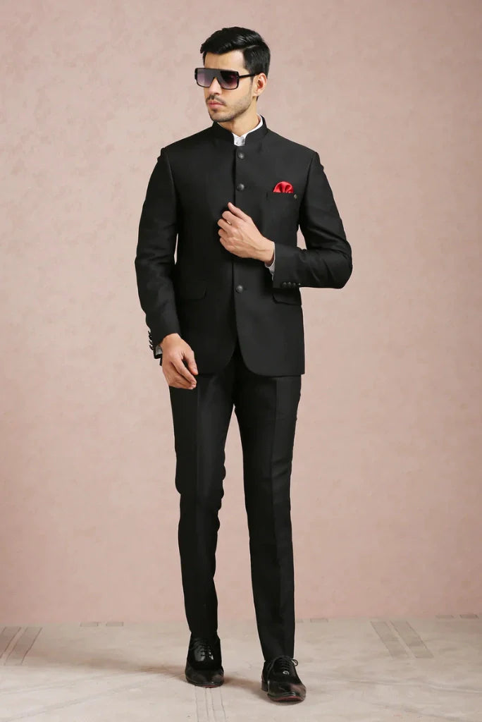 Imported premium suits for a groom wedding this is a specially designed black suit for the groom which will look great also known as the bandhgala, is a regal and versatile outfit that combines traditional craftsmanship with contemporary elegance Decent Looking Wear Best choice for groom the of the It is a slim fitting Suit with a distinctive high mandarin collar