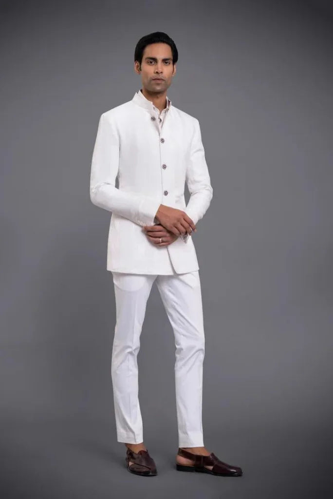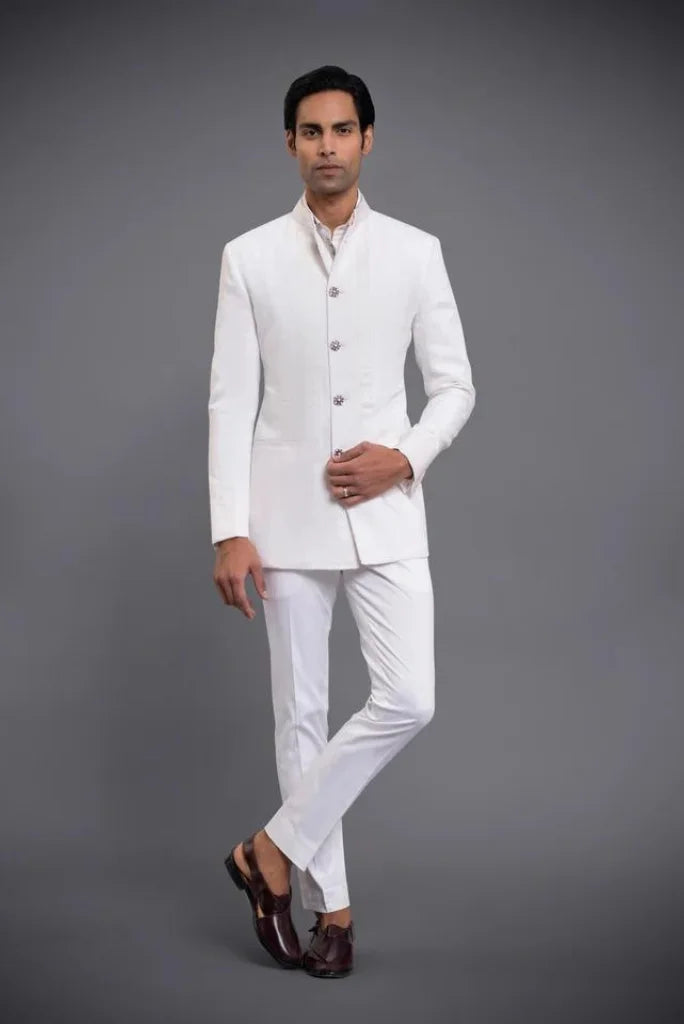 A White Bandhgala Jodhpuri Suit is the perfect outfit for Royal Weddings and events. Resplendent with the splendour and style of the ancient Maharajas, Jodhpuri suits are a paradise for all men. It is sure to give a royal look to anyone wearing it. The Bandhgala Coat comes in various fabrics including premium TR, Wool, Velvet, Jute, Suede Leather & Linen. It is an Indian classic that can be worn on any occasion. It is an ideal outfit to display your Indianness. It is imperative to have at least one of the timeless classics in your wardrobe.